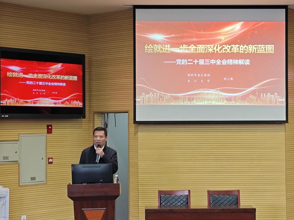 (通讯员 万宝荣)为深入学习宣传贯彻党的二十届三中全会精神,激发广大师生干事创业、奋发作为的积极性、主动性,10月31日下午,我院在农科大楼1056报告厅举行党的二十届三中全会精神宣讲报告会,特邀荆州市委宣讲团成员、我校马克思主义学院党委书记刘小燕作宣讲报告。报告会由学院党委书记王辉主持,学院教职工和学生代表参加报告会。