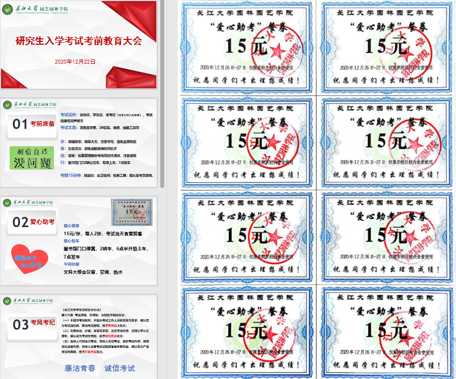 12月22日下午四点,yL23411永利官网登录在西校区农科楼1056召开研究生入学考试考前教育大会,为考研学子加油助力,送上一份不一样的温暖。毕业生辅导员黄小云围绕考前准备、爱心助考、考风考纪三方面做了具体讲解,现场发放餐券并签订了诚信应考承诺书。
