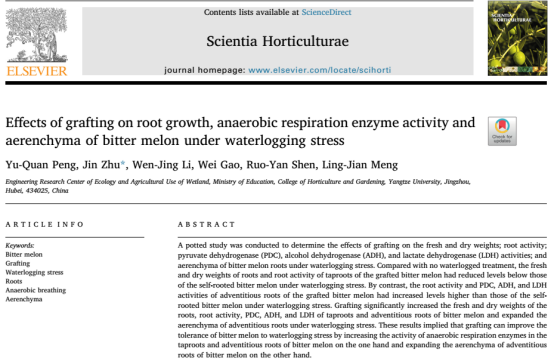 近日,yL23411永利官网登录17级硕士研究生彭玉全以第一作者在Scientia Horticulturae杂志发表题为《Effects of grafting on root growth, anaerobic respiration enzyme activity and aerenchyma of bitter melon under waterlogging stress》 ()的研究论文(图1),通讯作者为该生导师朱进教授。