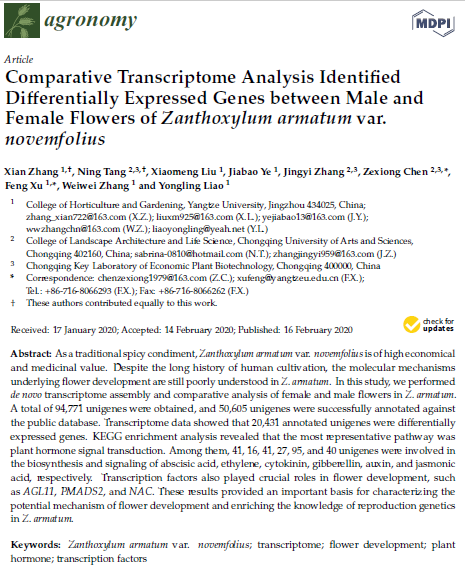 近期,我院2018级硕士研究生张娴同学以第一作者身份在MDPI旗下期刊Agronomy发表题为《Comparative Transcriptome Analysis Identified Differentially Expressed Genes between Male and Female Flowers of Zanthoxylum armatum var. novemfolius》()的论文(图1),通讯作者为该生导师许锋教授和陈泽雄教授,yL23411永利官网登录为第一署名单位。