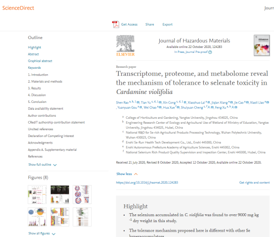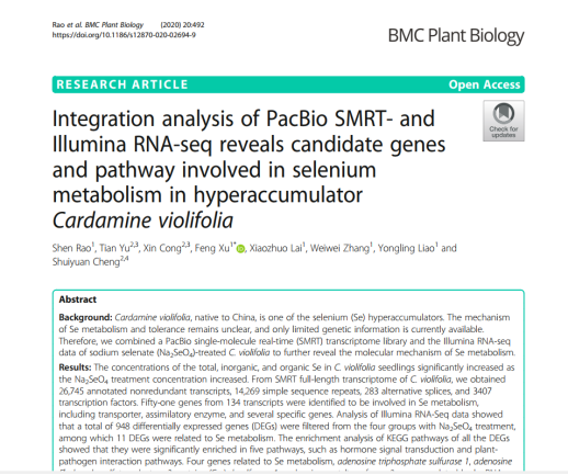 近日,我院许锋教授团队在国际著名学术期刊《Journal of Hazardous Materials》(环境科学1区,影响因子9.04)和《BMC Plant Biology》(植物学2区,影响因子3.5)上分别发表题为“Transcriptome, proteome, and metabolome reveal the mechanism of tolerance to selenate toxicity in Cardamine violifolia”与“Integration analysis of PacBio SMRT- and Illumina RNA-seq reveals candidate genes and pathway involved in selenium metabolism in hyperaccumulator Cardamine violifolia”的研究论文,揭开了超聚硒植物恩施碎米荠聚硒和耐硒的潜在机制。长江大学许锋教授为上述2篇论文的通讯作者,博士研究生饶申为这2篇论文第一作者,长江大学为第一署名单位。