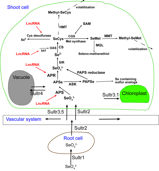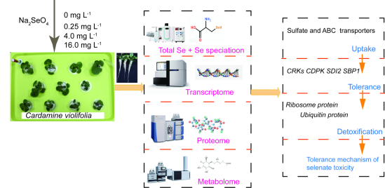 恩施碎米荠(Cardamine violifolia)是分布于我国恩施地区的一种硒超积累植物,具有极强的聚硒和耐硒能力。但是目前它的聚硒和耐硒机制仍然不明。许锋教授团队通过硒强化与营养液水培的方式,发现恩施碎米荠体内总硒含量在水培条件下可以达到9000 mg/kg DW,其主要硒形态为SeCys2和SeO42-。利用转录组、蛋白组和代谢组测序技术,全面分析了恩施碎米荠对硒酸盐毒性耐受的生理和分子机制。在恩施碎米荠对硒的吸收、转运、解毒和耐受方面提出了一些新的见解。研究认为,在恩施碎米荠吸收大量的硒后,钙依赖的蛋白激酶(CDPKs)、富含半胱氨酸的蛋白激酶(CRKs)等的表达下调,有利于减少细胞内活性氧的产生,同时减少硒代半胱氨酸非特异性取代半胱氨装配进入蛋白质的机会,进而减轻硒对细胞的毒性,这是恩施碎米荠重要的潜在耐硒机制。同时,该研究利用全长转录组和二代转录组技术分析了恩施碎米荠硒代谢的相关基因,发现一些硒代谢基因可能受到lncRNA的调控,并提出了恩施碎米荠硒代谢的通路。特别硒恩施碎米荠可能将硒代半胱氨酸降解为元素硒,排出体外,对于其聚硒和耐硒具有重要意义。上述研究结果对于恩施碎米荠在硒产业中开发利用具有很强的指导作用。