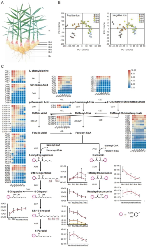 图3. 生姜重要次级代谢产物定量分析及姜辣素合成通路解析。A.样本采集示意图;B.以正/负离子模式鉴定到的生姜根茎代谢产物的主成分分析;C.姜辣素生物合成关键基因的表达通路。