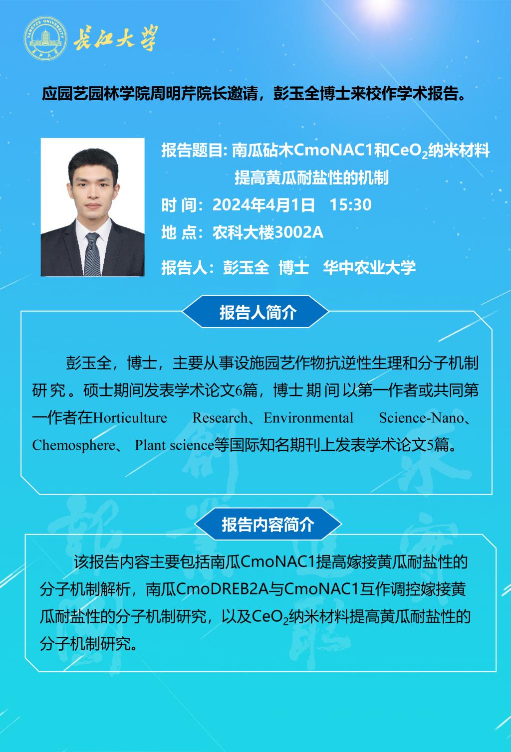 学院讲坛(2024年第四讲):南瓜砧木CmoNAC1和CeO2纳米材料提高黄瓜耐盐性的机制