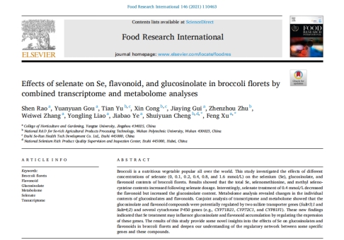 (通讯员 刘晓梦 桂嘉营)2021年5月,我中心2018级博士饶申在国际权威期刊《Food Research International》(农林科学1区,影响因子6.48)上发表题为“Effects of selenate on Se, flavonoid, and glucosinolate in broccoli florets by combined transcriptome and metabolome analyses”的研究论文,揭开了硒影响西兰花重要活性成分黄酮和芥子油苷的机制。该论文第一作者为饶申博士,通讯作者为许锋教授,第一署名单位为长江大学。