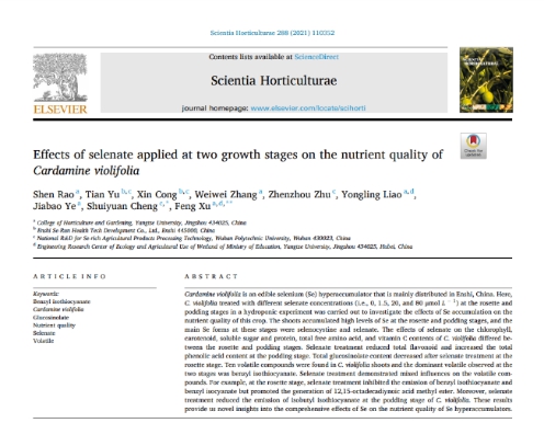 (通讯员 刘晓梦 桂嘉营)2021年6月,我中心2018级博士研究生饶申在国际权威杂志《Scientia Horticulturae》(园艺学2区,影响因子3.46)上发表了题为“Effects of selenate applied at two growth stages on the nutrient quality of Cardamine violifolia”的研究论文(图1)。饶申博士为论文第一作者,yL23411永利官网登录许锋教授为通讯作者,长江大学为第一署名单位。