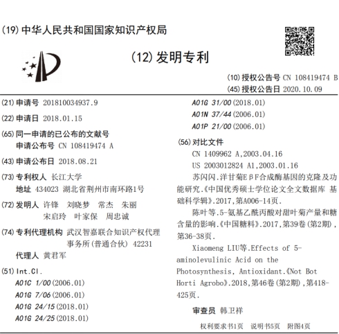 (通讯员 刘晓梦 向娟)202010月,我中心一种提高洋甘菊α-甜没药醇含量的方法国家发明专利授权(图1),导师许锋教授为第一申请发明人,2019级博士研究生刘晓梦为第二申请发明人。