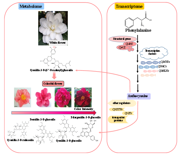 山茶花作为中国十大国花之一,其花色多样,色彩鲜艳,具有极高的观赏价值,但目前关于其花色的调控机制尚未见报道。本研究通过选择五种递进梯度颜色的山茶花瓣,利用转录组和代谢组联合分析技术,全面解析了山茶花色的分子调控机制。该研究结果为进一步阐明花色苷在植物颜色表达中的作用提供了新的思路。