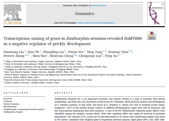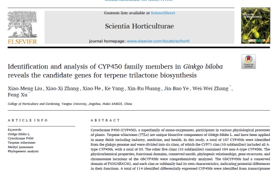 2022年5月,我中心博士研究生刘晓梦在国际学术期刊《Scientia Horticulturae》(农林科学2区,影响因子3.463)和《Genomics》(生物学2区,影响因子5.763)上分被发表了题为 “Identification and analysis of CYP450 family members in Ginkgo biloba reveals the candidate genes for terpene trilactone biosynthesis”和“Transcriptome mining of genes in Zanthoxylum armatum revealed ZaMYB86 as a negative regulator of prickly development”两篇研究论文。刘晓梦博士为第一作者,张威威副教授和许锋教授为通讯作者,长江大学为第一署名单位。
