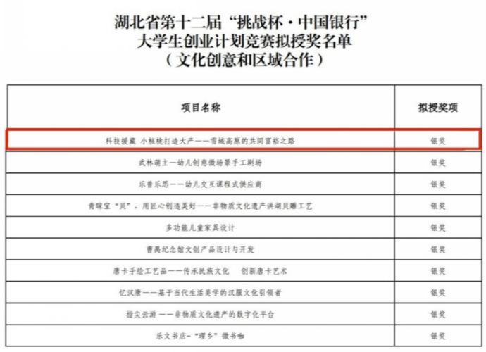 第十二届湖北省“挑战杯·中国银行”大学生创业计划竞赛是大学生课外科技文化活动中一项具有导向性、示范性和群众性的创新创业竞赛活动,对大学生的创新能力、动手实践能力、表达能力有极强的促进作用。在挑战杯的号召下,团队立足学科优势,瞄准援藏助农领域,以核桃产业为命题,扎根西藏,肩负使命,担当作为,将实现共同富裕的科技援藏新篇章书写在雪域高原上。