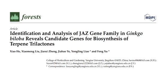 2022年5月,我中心2020级硕士研究生何筱在国际学术期刊《Forests》(农林学科3区,影响因子3.282)上发表了题为“Identification and Analysis of JAZ Gene Family in Ginkgo biloba Reveals Candidate Genes for Biosynthesis of Terpene Trilactones”的综述论文。硕士研究生何筱为文章第一作者,许锋教授和廖咏玲老师为通讯作者,长江大学为第一署名单位。