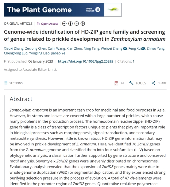 2023年1月,我中心硕士研究生张晓熙在国际学术期刊《The Plant Genome》(植物科学2区,IF:4.219)上发表题为“Genome-wide identification of HD-ZIP gene family and screening of genes related to prickle development in Zanthoxylum armatum”的研究论文。张晓熙为第一作者,张威威副教授和许锋教授为通讯作者,长江大学为第一署名单位。