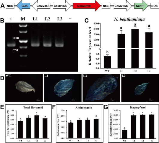该研究通过前期的组学分析,发现GbbZIP08转录因子可能参与银杏类黄酮的生物合成,为了验证GbbZIP08的功能,将GbbZIP08在本氏烟草中过表达,发现转基因烟草中的总黄酮,山奈酚和花青素含量均有显著提高。转录组测序结果显示,黄酮生物合成基因如PAL、4CL、CHI、FLS等明显上调。此外,植物激素信号转导通路,如脱落酸、水杨酸、生长素和茉莉酸通路富集了大量差异表达基因。大量转录因子如MYB、AP2、WRKY、NAC、bZIP和bHLH也有差异表达。该研究结果揭示了GbbZIP08在银杏黄酮类代谢途径中发挥着正向调节作用,为扩展和完善银杏黄酮类化合物代谢调控网络提供了一定的理论基础。