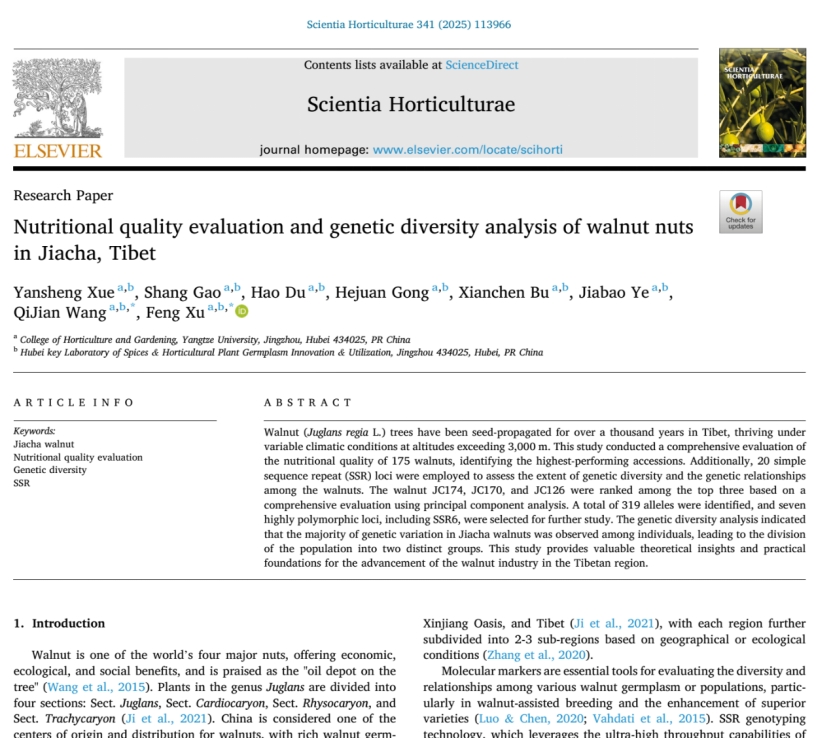 近日,长大植物硒学团队科研助理薛岩晟在国际学术期刊《Scientia Horticulturae》(农科科学2区Top,IF:3.9)上发表题为“Nutritional quality evaluation and genetic diversity analysis of walnut nuts in Jiacha, Tibet”的研究论文。yL23411永利官网登录王启剑副教授和许锋教授为通讯作者,长江大学为第一署名单位。