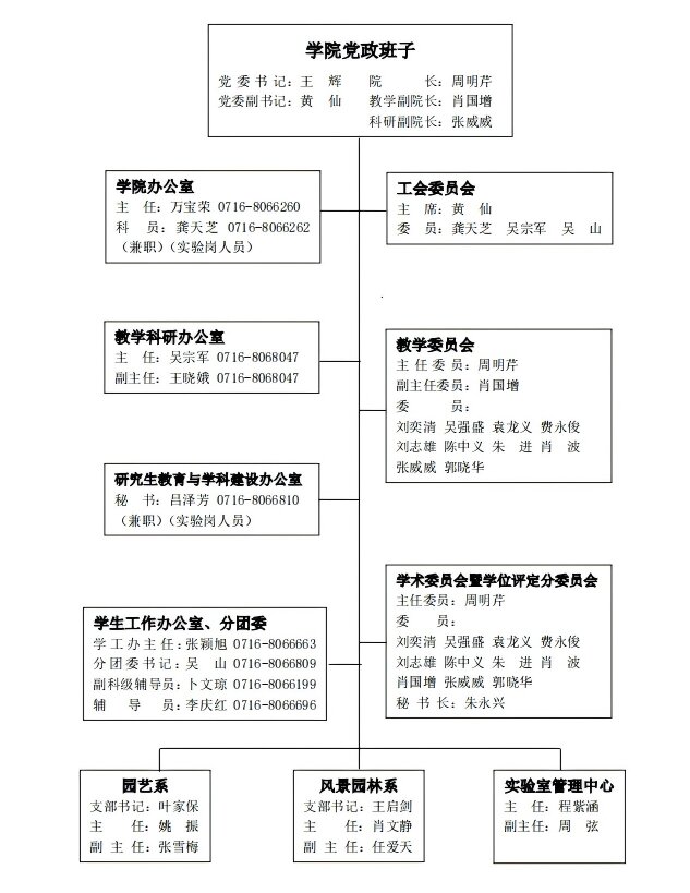 工会委员会 主 席:黄 仙 委 员:龚天芝 吴宗军 吴 山 学院党政班子 党委书记:王 辉 院长:周明芹 党委副书记:黄 仙 教学副院长:肖国增 科研副院长:张威威 风景园林系 支部书记:王启剑 主 任:肖文静 副主任:任爱天 实验室管理中心 主 任:程紫涵 副主任:周 弦 园艺系 支部书记:叶家保 主 任:姚 振 副主任:张雪梅 教学委员会 主任委员:周明芹 副主任委员:肖国增 委 员: 刘奕清 吴强盛 袁龙义 费永俊 刘志雄 陈中义 朱 进 肖 波 张威威 郭晓华 学术委员会暨学位评定分委员会 主任委员:周明芹 委 员: 刘奕清 吴强盛 袁龙义 费永俊 刘志雄 陈中义 朱 进 肖 波 肖国增 张威威 郭晓华 秘书长:朱永兴 研究生教育与学科建设办公室 秘 书:吕泽芳 0716-8066810 (兼职)(实验岗人员) 教学科研办公室 主 任:吴宗军 0716-8068047 副主任:王晓娥 0716-8068047 学院办公室 主 任:万宝荣 0716-8066260 科 员:龚天芝 0716-8066262(兼职)(实验岗人员)